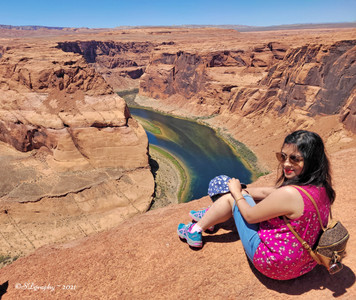 Our little one was sleeping while we started for the walk. We ensured to cover his stroller nicely to save him from the heat and dust from the path. As we approached near the Bend we realized water and caps/hats are a must to stay cool. There was a iron rail-guard straight up as we reached the Horseshoe Bend site. It was like nowhere an open wide drop. Really amazing to see nature's such a masterpiece. A huge structure in the middle surrounded by a green stagnant or slow moving Colorado river. We could see plenty of kayaks, boats also moving in the river down. Everyone around were going to the edges with safety to get the best of the view , to take a selfie or groupy with the best of the view downwards, but yes it was scary at the edge and risky too. You got to be very careful not to cross the limit & lose your balance anytime.